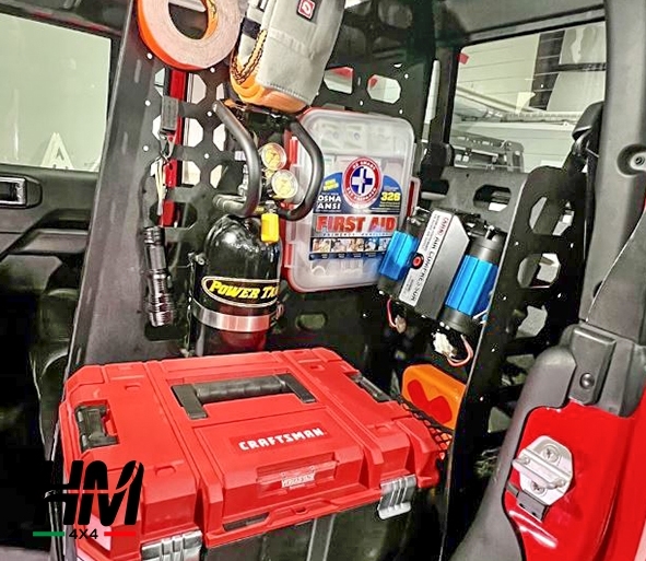 Rock Slide rear seat cargo rack fits conveniently in the single rear seat behind the driver’s seat. The rack system provides plenty of options to mount gear and even has a hinged base tray so you can still use the storage under the rear seat.