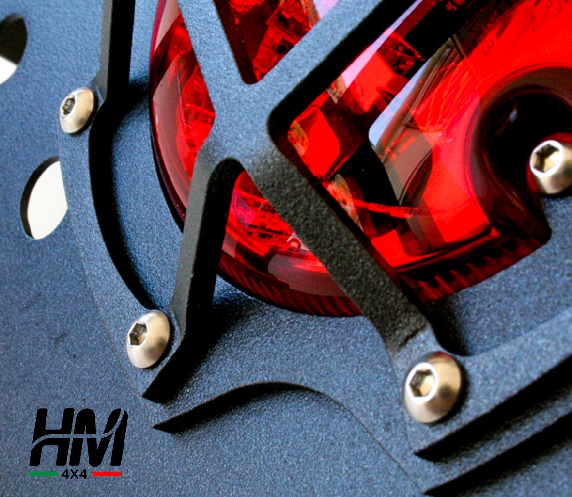 Pair of rear cantonal covers for Defender 90 of any year and motorization, made of steel, galvanized and polyester powder coated particularly suited to withstand external atmospheric agents, are covered in Italy and are complete with protection grilles for the NAS headlights.