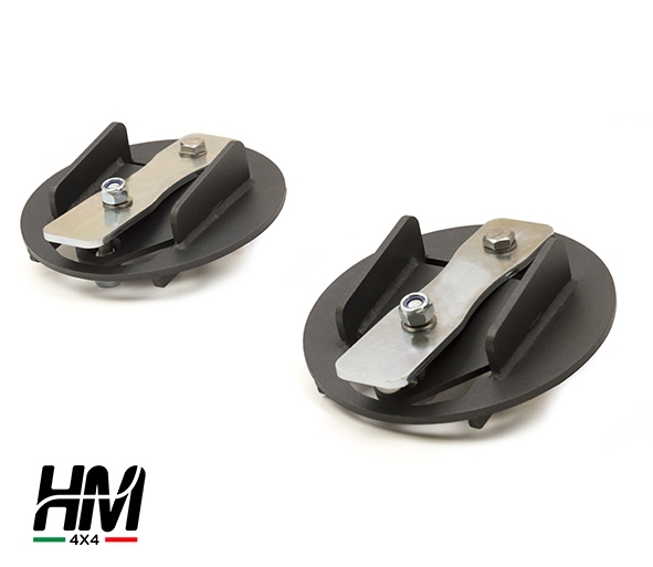 This pair of support plates for the rear springs of the Land Rover Defender 110 and 130, completely Made in Italy are adjustable angled and advanced to correct the position of the springs when using particularly raised structures and elongated struts or long arm.