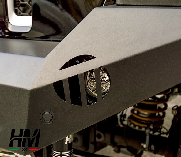 Questo paraurti fuoristrada, 100% Made in Italy, è realizzato in acciaio C45 e verniciato con polveri epossidiche appositamente studiate per l'uso all'esterno nel colore nero opaco goffrato, la verniciatura e le finiture sono particolarmente curate ed il colore riprende quello della plastica dei parafanghi originali.