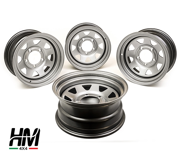 kit composto da 4 cerchioni jimny in acciaio in stile modulare, disponibile in 4 diversi offset per adattarsi alla spaziatura richiesta.