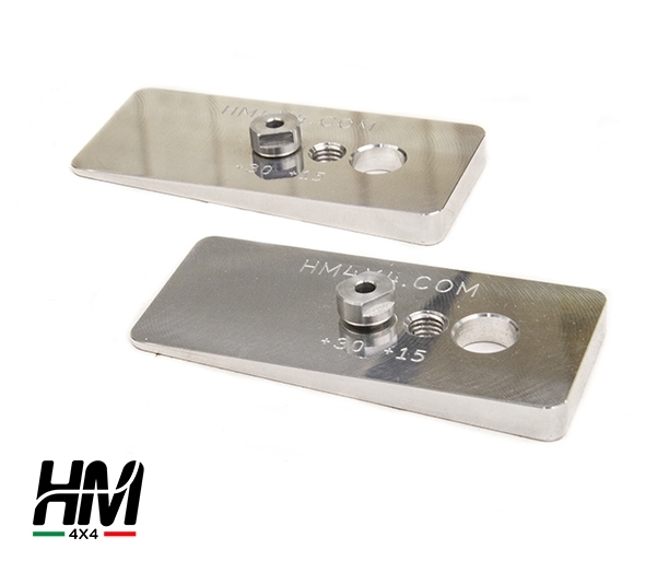 - coppia di piastre in duralluminio da interporre tra il ponte e le balestre, il doppio foro filettato permette un avanzamento di 15 o 30mm;