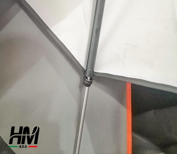 La protezione è fissata alla tenda stessa e alle molle a gas. Grazie alla cerniera su entrambi i lati, la copertura antipioggia può essere utilizzata sia sul lato destro che su quello sinistro.